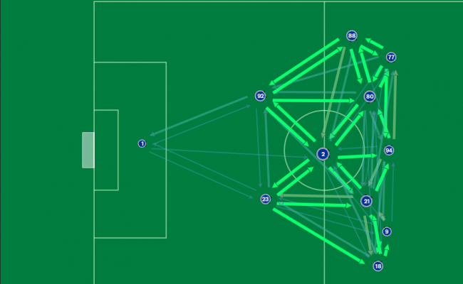 Oyunu sürekli rakip sahada oynayan, pas kalitesini burada gösteren bir takım düşünün. Acele karar vermemize gerek olmadan, sakin bir futbol oynayarak adım adım ilerlemek Pep’in en büyük etkisi değil midir? Burada ise kanatların oyuna genişlik katmasıyla beraber hücum hattımızı üçleme şansımız oluyor. Kanatlarımız forvet bölgesine yani iç bölgeye hareket ederek hem rakibi dar alana sıkıştırıyoruz hem de göbekten oyun kurarken rahat bir alana sahip oluyoruz. Tabi bunları yaparken beklerin genişlik kazandırması bizim için en önemli adım oluyor. Çünkü gördüğünüz üzere kanat ile beklerin yakınlığıyla beraber orta sahamızın da bu isimlere çember oluşturabilecek bir alanda durması, pas oyununda bizi büyük bir avantaja dönüştürüyor. Haliyle pas aralarını sık sık görebileceğiniz pozisyonlar da olacaktır.