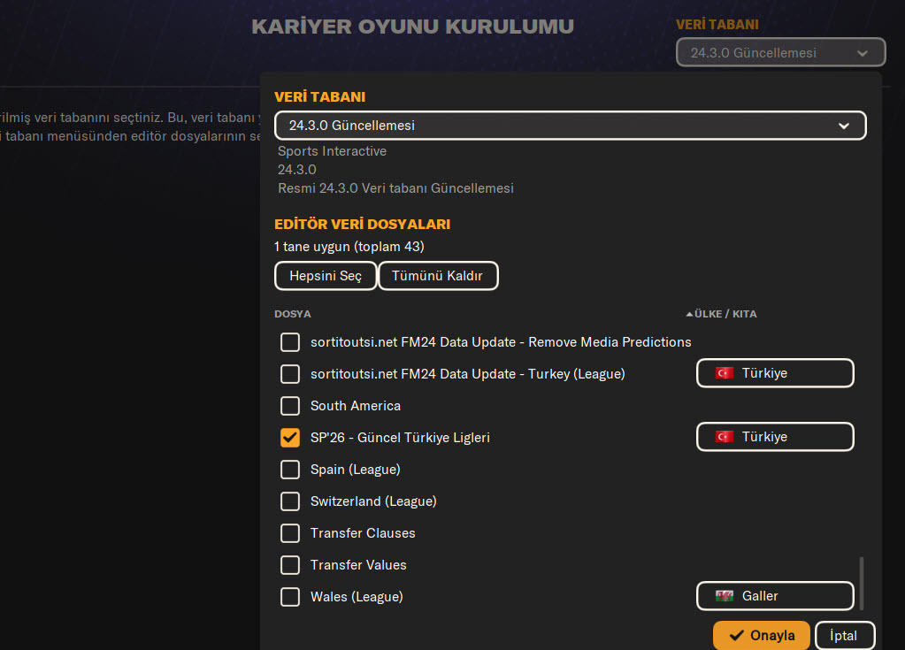 2- Şimdi Football Manager 2024’ü açıyoruz ve yeni kariyer açıyoruz. Kariyeri oluştururken editör data’nın içine attığımız tüm dosyaların yanındaki kutucuğun işaretli olduğundan emin olup kariyerinizi kurmaya başlıyorsunuz.