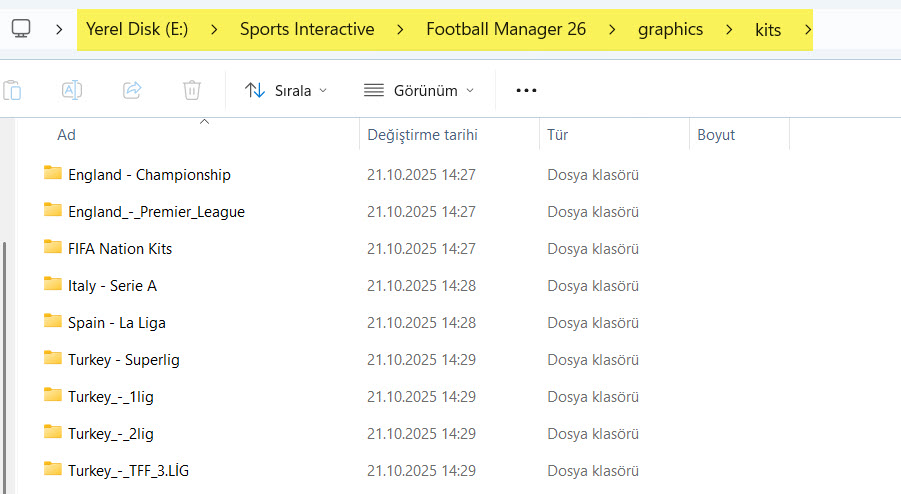 2) İndirmiş olduğunuz forma paketinin klasörünü C:\Users\Kullanıcı Adı\Documents\Sports Interactive\Football Manager 26\graphics\kits içerisine kopyalayınız. (Belgelerim\Sports Interactive\Football Manager 26\graphics\kits)