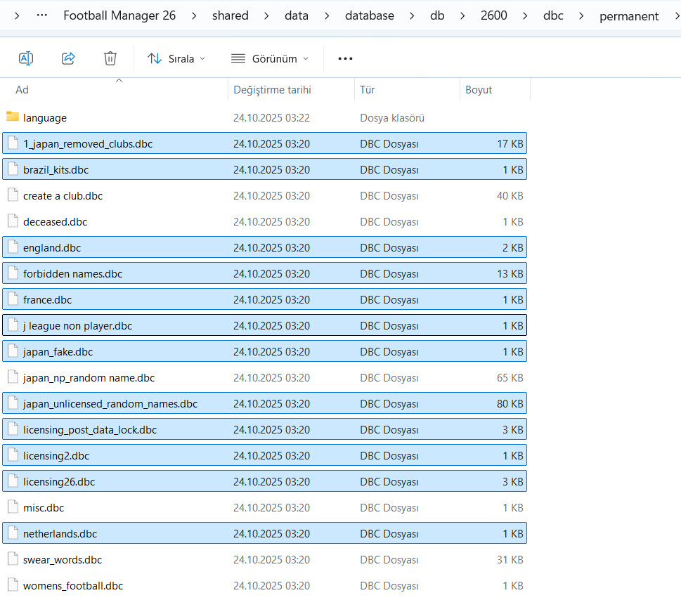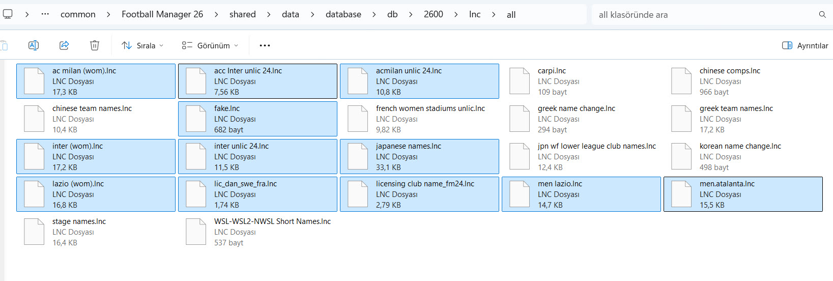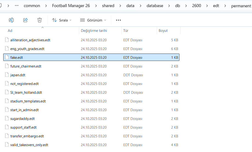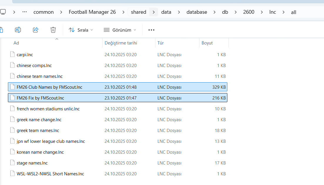 5. İndirdiğiniz dosyada yer alan “FM26 Fix by FMScout” ve “FM26 Club Names by FMScout” dosyasını buraya kopyalayın.