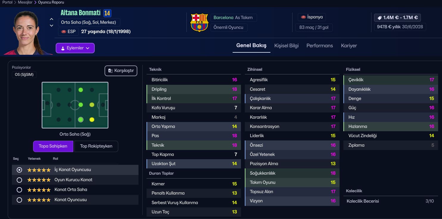 11) Şimdi Football Manager 26’ya giriş yapın ve oyuncu profillerinde renklerin değiştiğini göreceksiniz.