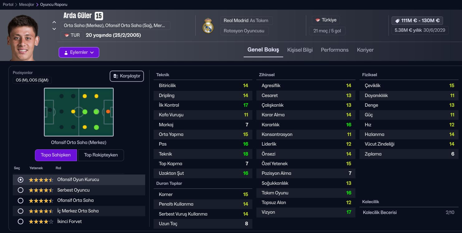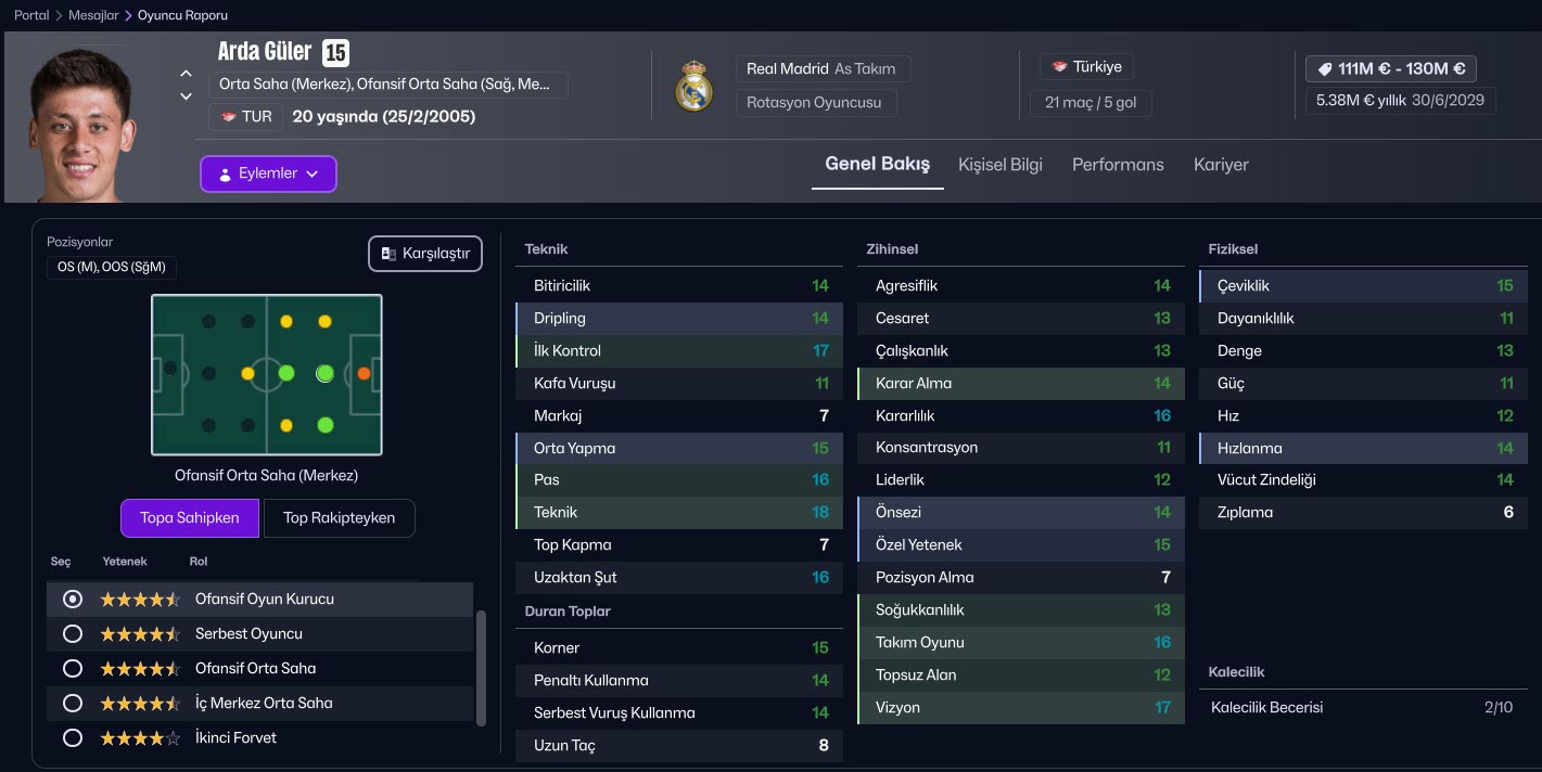 Kurulum adımına geçmeden önce mevcutta oyunda oyuncu profillerinin renkleri nasıldı Arda Güler’in FM26 profiliyle hatırlayalım.