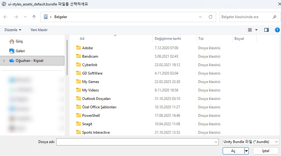 Belgeler olarak açılan bu ekrana kopyaladığımız dosya yolunu “Belgeler” yazan yere yapıştıyoruz ve enter tuşuna basıyoruz. (Altta fotolarını görebilirsiniz) “ui-styles_assets_default” dosyasını buluyoruz ve “Aç” butonuna basıyoruz.