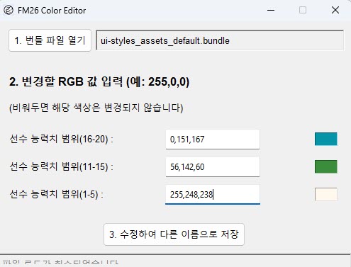 FM26 Color Editor programı 3 farklı renk kodu seçimi yapmanızı bekliyor. Burada renk kodları olarak aşağıda videosunu da bıraktığımız Fmsohbetleri’nin renk kodlarını direkt kullanabilirsiniz.