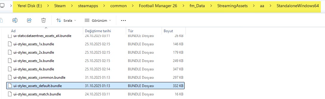 Steam’in Kurulu Olduğu Sürücü (C, D veya E gibi) \Program Files (x86)\Steam\steamapps\common\Football Manager 26\fm_Data\StreamingAssets\aa\StandaloneWindows64
