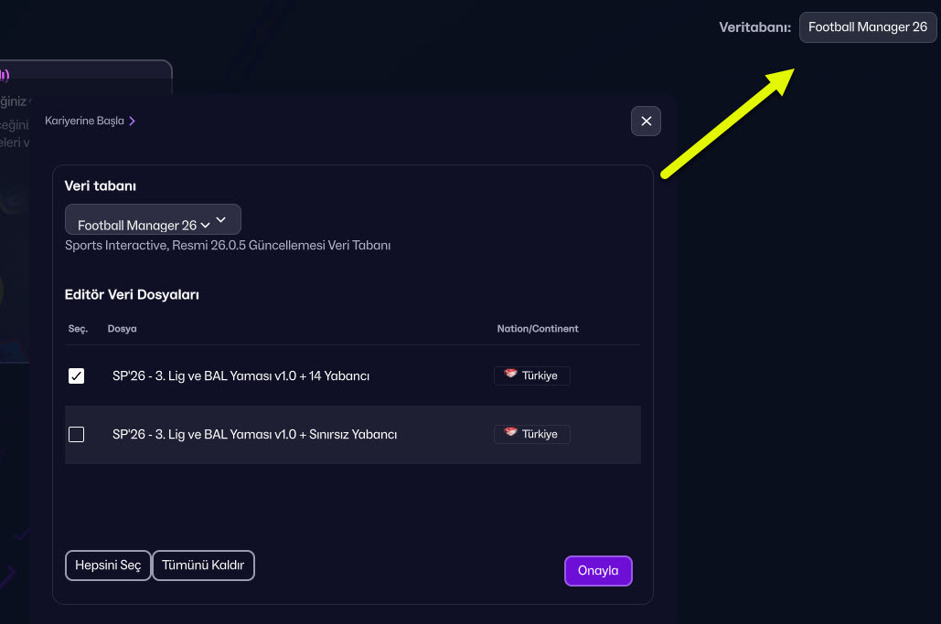 4) Gelen ekranda editör data ekranına attığınız “SP26 – 3.Lig ve BAL Yaması v1.0- 14 Yabancı” seçin.