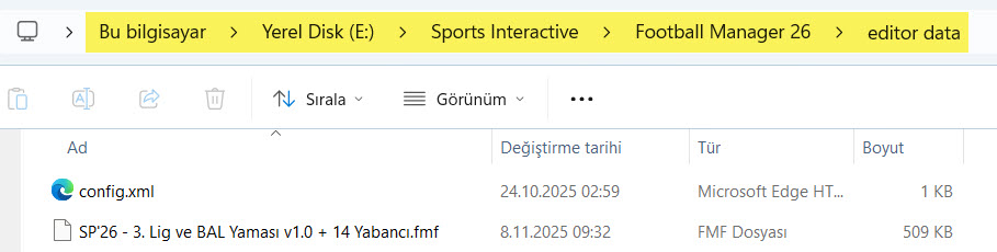 İndirmiş olduğunuz fmf dosyasını C:\Users\Kullanıcı Adı\Documents\Sports Interactive\Football Manager 26\editor data klasörü içerisine kopyalayınız. (Belgelerim\Sports Interactive\Football Manager 26\editor data)