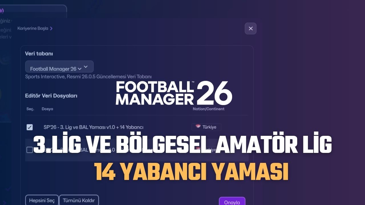 Football Manager serisine her sene istisnasız kurduğumuz yamaların başında gelen Türkiye alt ligler yaması bu sene de çıktı. Selim Atalay nam-ı diğer Sinyor Selim’in Türkiye Ligleri için yapmış olduğu 3.Lig + Bölgesel Amatör Lig + 14 Yabancı Yaması FM 26’da Eskişehirspor, Denizlispor, Altay, Karşıyaka gibi Türk futbolunda önemli yere sahip olan takımlarla uykusuz gecelere adım atmanızı sağlıyor.