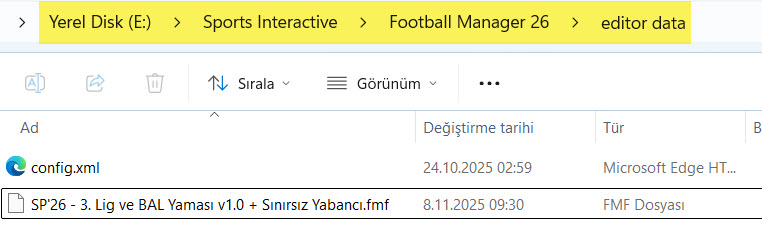 İndirmiş olduğunuz fmf dosyasını C:\Users\Kullanıcı Adı\Documents\Sports Interactive\Football Manager 26\editor data klasörü içerisine kopyalayınız. (Belgelerim\Sports Interactive\Football Manager 26\editor data)