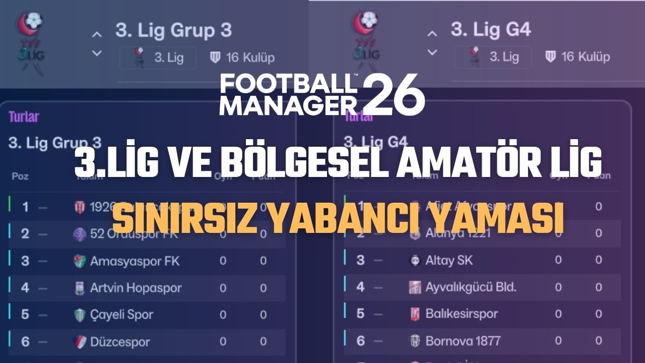 FM26’da 3.Lig takımları veya Bölgesel Amatör Lig takımlarıyla kariyer yapmak isteyenlerin merakla beklediği yama çıktı. İşte FM26’ya Türkiye 3.Lig ve Bölgesel Amatör lig takımlarını sınırsız yabancı oyuncu kullanma özelliğiyle getiren yamanın detayları.