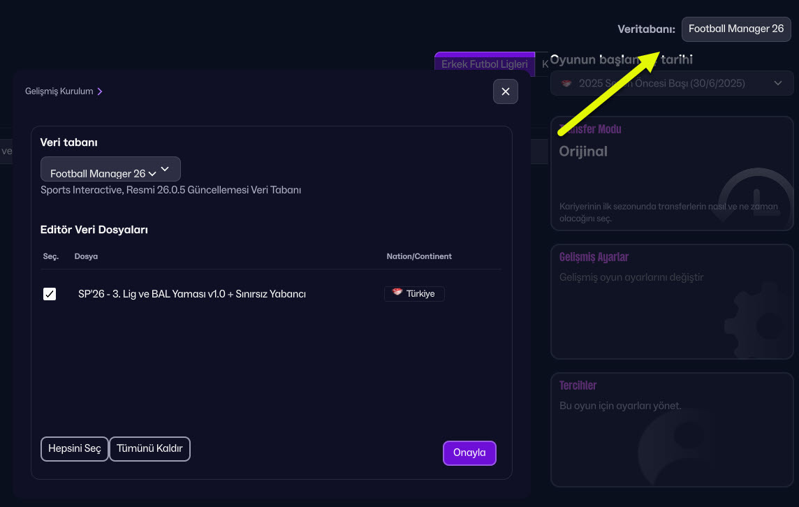 4) Gelen ekranda editör data ekranına attığınız “SP26 – 3.Lig ve BAL Yaması v1.0- Sınırsız Yabancı” seçin.