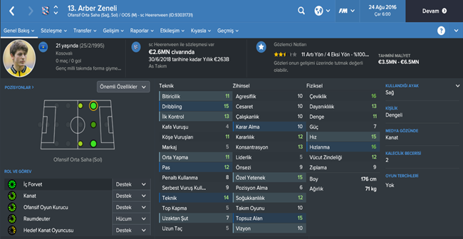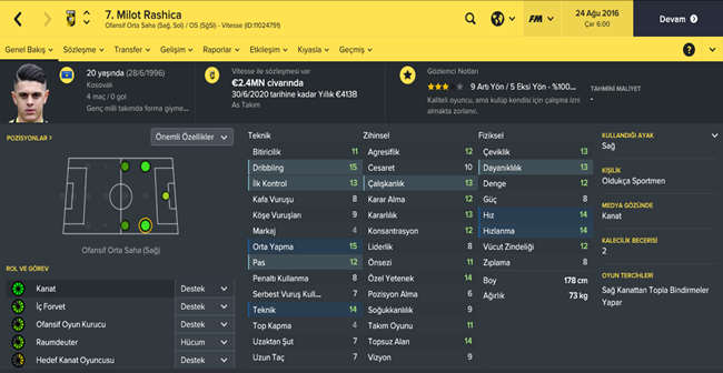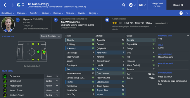 Kosova incelememize Avdijaj ile başlıyoruz.Kendisinden bir önceki yazılarımızda sıkça bahsetmiştik.On numara diye tabir edilen oyuncu forvet ve forvet arkası rollerinde başarıyla görev yapıyor.Bir kaç taktik ve fizik gelişimi ile Avrupa standartlarında bir golcü elde edebilirsiniz.