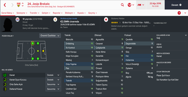 Merkez ve ofansif ortasahanın her iki kanadında da oynayabilen Brekalo henüz 18 yaşında. Doğru antrenman programı ve düzenli forma şansı verilmesi durumunda gayet iyi bir oyuncu olma potansiyeli taşıyan oyuncuyu gelecek planlaması yapan hocalarımıza şiddetle tavsiye ediyoruz.