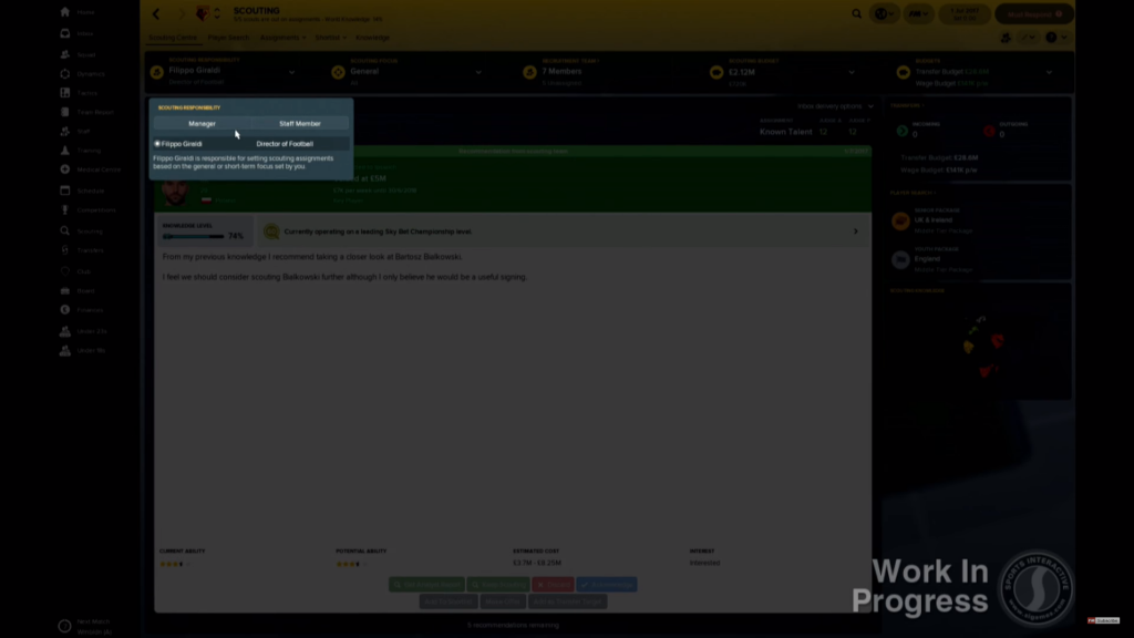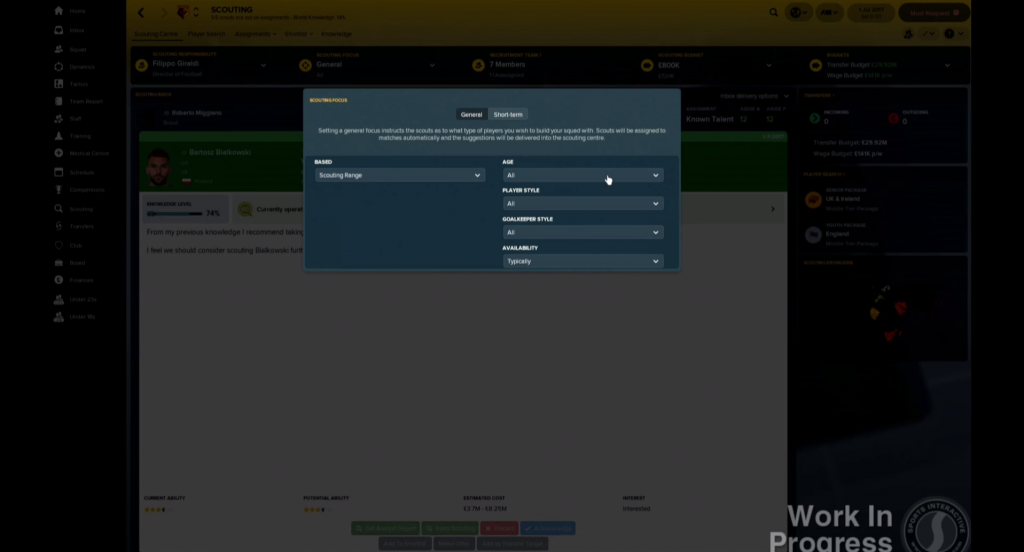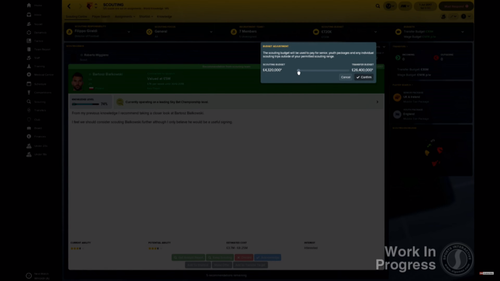 Oyuncu araştırma için artık kendi bütçe ayarlaması yapabiliyoruz. Oyuncu araştırmasına ayırdığımız her bütçe transfer ve maaşlar için mevcut bütçenin dengesini etkiliyor, çok dikkatli olmak lazım.