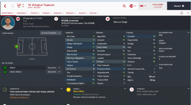 Kale konusunda biraz sıkıntı yaşadık. Çünkü 1.Lig’deki çoğu kaleci hep aynı kalıyor. X takımından Y takımına geçiyor ve kısır döngü kaleciler hep aynı kalıyor. Bu sene 1.Lig dışından gelen bir kaleciyi kaleye katmak istedim. Sezon başında Fenerbahçe’den biraz dikkat çekici bir bonservis rakamıyla Boluspor’a transfer olan Ertuğrul Taşkıran 1.Lig’deki en iyi kaleciler arasında yer alıyor. Henüz gerçek sezon da bir resmi maça bile çıkmasa FM adına harika bir transfer olarak görebiliriz Ertuğrul’u. Ertuğrul, çoğu Süper Lig takımında bile çok rahat forma giyecek potansiyelde.