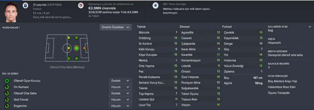 Valbuena ilerleyen yaşına rağmen yüksek performans göstermeye devam eden oyunculardan. Aykut Hoca’nın listesinin başında yer alıyordu. Hoca, Valbuena’yı tanımlarken şu ifadelere yer vermişti. “Seni takımın merkezi olarak düşünüyorum. Takıma liderlik edecek tecrübe ve istikrara sahipsin. Takımda kaybolan ruh, senin liderliğinde tekrar oluşacak.” Sezona da böyle başladı Valbuena ama takım O’na gerekli reaksiyonu veremedi. Bakalım ilerleyen süreç bize neler gösterecek. FM kısmına dönersek, ilk olarak şu hatırlatmayı yapmak isterim. FM18’e başladığımızda Valbuena 33 yaşında olacak. Fiziksel olarak birkaç puanlık düşüşler olacaktır. Ancak Valbuena’yı sol önde ve ofansif orta sahada oyun kurucu olarak ve hücum rolü ile sahaya sürersek maksimum verimi alabiliriz. Geri dönüşler ile yorulmayacak ve esas özellikleri olan teknik ve zihinsel gücünü gol yollarında kullanacaktır. Ortalama üstü duran top kullanıcısıdır. Kart görmeye müsait bir oyuncu olan Valbuena, maç içerisinde sarı kart görürse takibe alınmalı ve hatta önemli maçlardan önce kart sınırı durumu dikkate alınmalıdır. Oyun tercihi olarak boş alanlara koşu yapar ve topla fazla buluşur. Fenerbahçe takımını alacak arkadaşlara tavsiyem, Giuliano ile Valbuena’yı yanyana kullanmaları ve zaman zaman pozisyon değiştirmeleridir. Zira oyuncu özellikleri ve oyun tercihleri olarak birbirini tamamlayan puzzle parçaları gibiler. Ayrıca uzaktan şut değerini (11) düşük bulduğum için, atakları erken bitirmemek adına bence şutu çok zorlanmamalı. Özellikle sol önde oynarken, arka direğe atabileceği sürpriz paslar ile size asist katkısı verecektir. Zihinsel özelliklerine bakacak olursak, Aykut Kocaman’ın beklentilerine karşılık verecek cinsten. Oyunda önemi yüksek maçlarda saklanmayan oyunculardan Fransız yıldız. Geçmişinde sadece iki ligde oynaması, uyum konusunda kendisini biraz eksik bırakmış, ancak Fenerbahçe kadrosunda Fransızca konuşanların sayısının az olmaması bir avantaj.