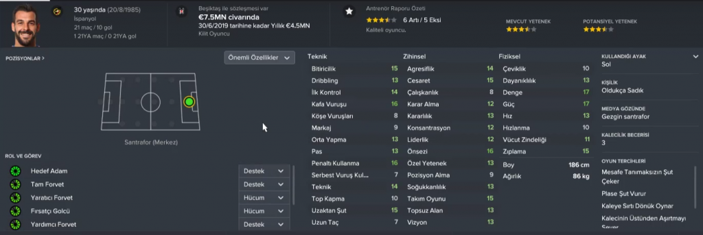 Negredo ile FM kariyerlerimde yolum hoca olarak birkaç kez kesişti. Kendisinden tek forvette, “Tam Forvet” rolünde oldukça yüksek verim aldım. Bu sebeple yeni sezonda transfer edilen büyük golcüler arasından seçimimi yaparken, eski öğrenci kayırması olmuş olabilir. Hele ki Gomis, rakip defansı da kaleye sokarak birer ikişer goller atarken, Negredo’yu seçmem sizleri şaşırtmış olabilir. Ancak FM kariyerlerimde Negredo, değişen taktiklerinize uyum sağlayabilen çok yönlü bir golcü. Negredo, tam bir ceza sahası golcüsü ve bu büyük takımlar için aranan kan. Önsezisi kuvvetli, cesareti yüksek ve agresif bir golcü. Beşiktaş son yılarda her sene golcüsünü değiştirmesine rağmen performans sıkıntısı yaşamadı. Eski golcülere bakınca, Negredo’yu içlerinden en çok Mario Gomez’e benzetiyorum. Belki O’nun gibi sezona yavaş girip sonra açılacak. Oyuna geri dönecek olursak; Negredo sürpriz şutlar atmayı seven, kaleye sırtı dönük oynayarak kanatlardaki forvetlere asist yapabilen, kaleci ile karşı karşıya kaldığında soğukkanlılıkla bitirebilen bir oyuncu. İşte bu özelliklerin aynısını Mario Gomez için de zamanında dile getirmiştik. Takımın penaltıcısı olabilecek bir isim Negredo ve bu sayede gol sayısını arttırarak moral kazanabilir. Genelde İspanyol oyuncularda görünen uyum sorunu Negredo’da yok. Büyük maçları seçer ve maçın adamı olabilecek kadar performans verir. Oyunda sakatlanma eğilimi yüksek bu sebeple iyi bir yedeği kadroda bulunmak zorunda.