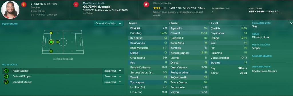 Denayer transfer sezonunda kendi ifadesi ile son güne kadar Galatasaray’ı bekledi ve bu transfer gerçekleşti. Ayrılırken üzdüğü taraftarları, transferin son günlerinde dönüşü ile sevindirdi. Denayer, fiziksel özellikleri ile büyük takımların sahip olması gereken bir oyuncu. Yıldız adayı olarak keşfedilen Belçikalı stoperin öne çıkan özellikleri; hızı, topu oyuna iyi sokabilmesi ve çok yönlü bir oyuncu olması. Böyle bir oyuncunun bir tık üstü elit seviyeye çıkmış olur. Zaten City takımı da bu sebeple oyuncudan vazgeçmiş değil. Sürekli olarak gelişimini takip ediyorlar. Denayer, kişisel antrenmanlarla hızla gelişebilen bir oyuncu, henüz potansiyeline ulaşamadığı için bu antrenmanlar kendisi için önemli. Gelişimi planladığımız gibi olursa, muhtemelen gelecek sezon City kadrosunda rotasyon oyuncusu olarak devam edecektir. Bu sebeple FM18’de Galatasaray ile yola çıkacak arkadaşlar bu duruma hazırlıklı olmalı.Diğer Sayfaya Geçmek İçin Aşağıdaki Sayfa Yönlendirmelerini Kullanabilirsiniz veya Buraya Tıklayarak 4.Sayfaya Geçebilirsiniz.