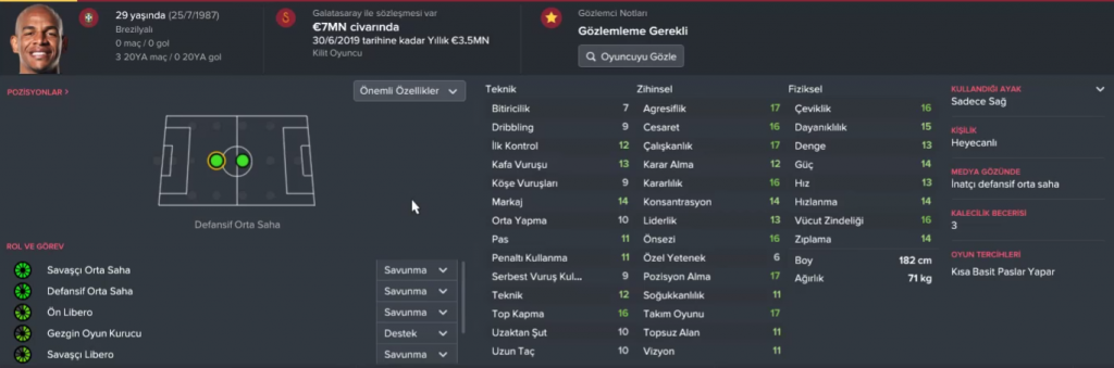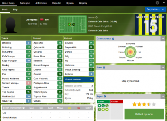 Transfer United’ın Manchester City’den bir başka transferi Fernando, 4-1-4-1 taktiğimin en kilit parçası. İlerleyen günlerde bu taktiğimin detaylarını sizlerle paylaşacağım. Bu sebeple takipte kalmanızı öneririm. Fernando, City’nin hovarda transfer politikası sonucu şişen kadronun kurbanı oldu. Kendisini Melo ile kıyaslan var, ben bu görüşe katılmıyorum. Melo sert bir oyuncuydu. Fernando ise akıllı ve oyunu okuyabilen bir oyuncu. Fernando’nun oyuncu özellikleri bana Aurelio’yu hatırlatmakta. Pozisyon alma bilgisi (17), top kapma becerisi (16), yeterli pas özelliği (11), gezerek oynamayı sevmesi… Fernando bu sezon taraftarın sevgilisi olacak ve bunu belki de hiç gol atmadan yapacak. Bu arada gerçek bir efsane olan Marco Aurelio’yu hatırlamak gerekirse;