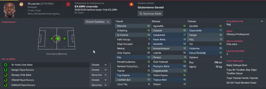 Gözden Kaçmadı: Bu bölge için kafamdaki bir diğer isim Badu Ndiaye oldu. Ndiaye ligimizde yıllar içinde gelişerek, geçtiğimiz sezona damga vuran isimlerden oldu. Kendisi ile birkaç sezon geçirdiğim FM tecrübelerime dayanarak, orta sahada “iki yönlü orta saha” oyuncusu olarak zirve yapabilen bir isim. Kendisi henüz 25 yaşında ve profilini incelediğimizde birçok oyun tercihleri kazanmış durumda. Rakip ceza sahasına girer, rakibin sağından atıp solundan geçer, topla koşusu var, ayakta savunma yapar…. Kendisini Osmanlıspor’a geldikten sonra, FM’de de yakından takip ettim ve şuan geldiği nokta heyecan verici. Bazen bir oyuncu için bir takım seçersiniz ya, Badu bu isimlerden biri bence. “Eee Mert o kadar övdün, neden kadronda yok” dediğinizi duyar gibiyim. Zor bir seçim oldu ancak yazımın başında da söylediğim gibi taktiksel olarak MC pozisyonunda tek oyuncu ile oynadığımdan ve savunma özellikleri bakımından Fernando sistemime daha uygun olduğu için kendisi dışarda kaldı. Yoksa Badu gözden kaçacak bir oyuncu değil.