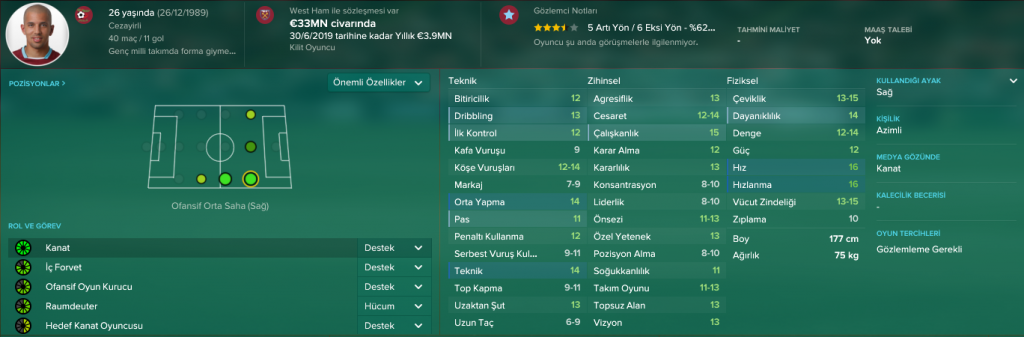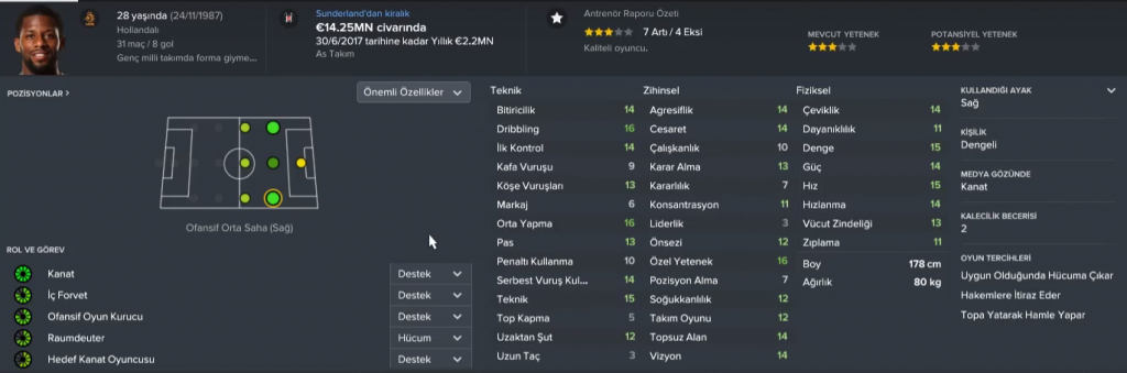 Feghouli azimli yapısı, sağ kanatta hızı ve tekniği ile adam eksiltebilmesi, ceza sahasına girebilen çok yönlü bir oyuncu olması ile dikkatleri üzerine çekti. FM kariyerimde zaman zaman rakip olarak karşılaşmalarımızda “Maçın Adamı” seçilecek performanslar göstermiş, zaman zaman sezonluk performanslarında dalgalanmalar olsa da sürekli olarak takımının en iyi performans veren oyuncularından olmuştur. Sizler gibi “Manager”lerin elinde bu dalgalanmayı en aza indirmek için, gerek maç içinde gerekse sezon içinde pozisyonunu AMC-AMR arasında değiştirmeniz. Potansiyeline ulaşmış bir oyuncu olan Feghouli için ödenen 4.25M Euro oldukça makul bir rakam. Profesyonellik anlamında bazen sıkıntılar yaşadığı için, cezalar ile O’nu çok sıkmamanızı öneririm. Kendisi kariyeri boyunca ağzını tutan ya da takım kimyasını önemseyen bir oyuncu olmamıştır. Tabi ki patron sizsiniz.