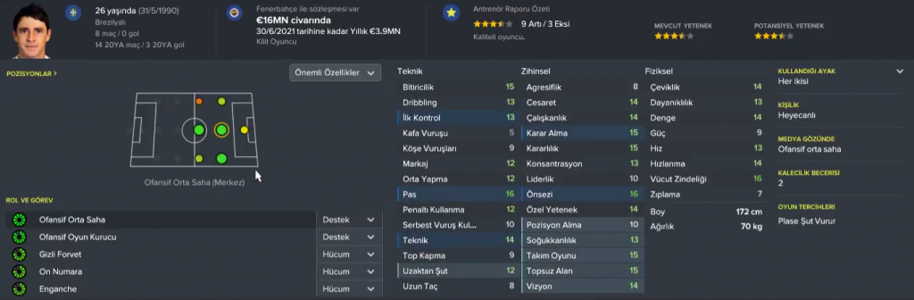 Fenerbahçelilerin yıllardır beklediği 10 numara transferi: Giuliano. Neymar’lı, Coutinho’lu gerçek Brezilya Milli Takım oyuncusu. Beklenti büyük. Herkes O’ndan Alex vari sihirbazlıklar bekliyor ama bence farklı tarz bir oyuncu. Giuliano, pozisyonuna göre üstün bir takım oyuncusu, ayrıca pas yüzdesi oldukça yüksek. Sıkışan oyun içinde kendini sağ kanada atabilen bir oyuncu. Zenit’te bu pozisyonda oldukça fazla maça çıktı ve Lucescu ile kariyer sezonunu geçirdi. Bir başka tanıdık Mancini gelir gelmez üzerini çizince Fenerbahçe’nin yolunu tuttu. Ödenen 7M Euro bonservis bence milli oyuncu için makul. Fenerbahçe’de gerek oyunda gerek gerçek hayatta ileri ucu besleyecek kilit oyuncu olacaktır. Hücumda Valbuena’nın da yükünü hafifletecek ve çeşitlilik katacaktır. Giuliano yaşı doğrultusunda gelişimi devam eden bir oyuncu. Antrenman programı özel olarak ayarlanmalı ve takip edilmeli. Örneğin pozisyonuna ve tekniğine göre ilk kontrol değeri biraz düşük. Giuliano gezen, topsuz oyunda başarılı, iki ayağını kullanabilen gerçek bir Brezilyalı. Taktik olarak da size esneklik sağlayacaktır. Örneğin; 4-3-3 için gerçek bir MC-Oyun kurucu-hücum rolünde ve sağ önde yine oyun kurucu rolünde, 4-2-3-1 için AMC ve AMR pozisyonlarında başarılı performans verecektir. Hatta özel antrenmanlar ile ikinci forvet olarak da çok başarılı olduğunu takip ettiğim birkaç kanaldan doğrulattım. FM18’de bunu ben de deneyeceğim.