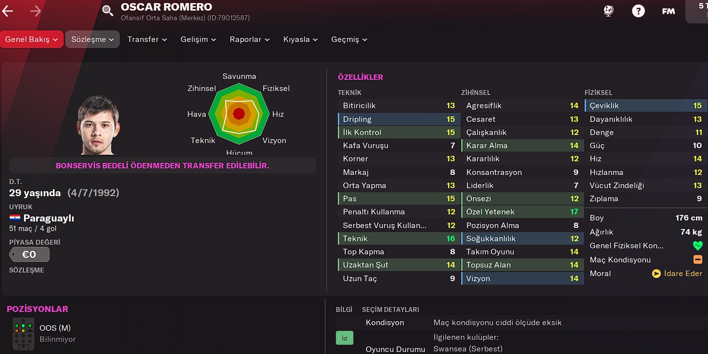 50.000€ 200.000€ arası bonservis bedeli ile hemen transfer edilebilir / İsteğe göre oyun başı imza attırılabilir (devre arası gelir)